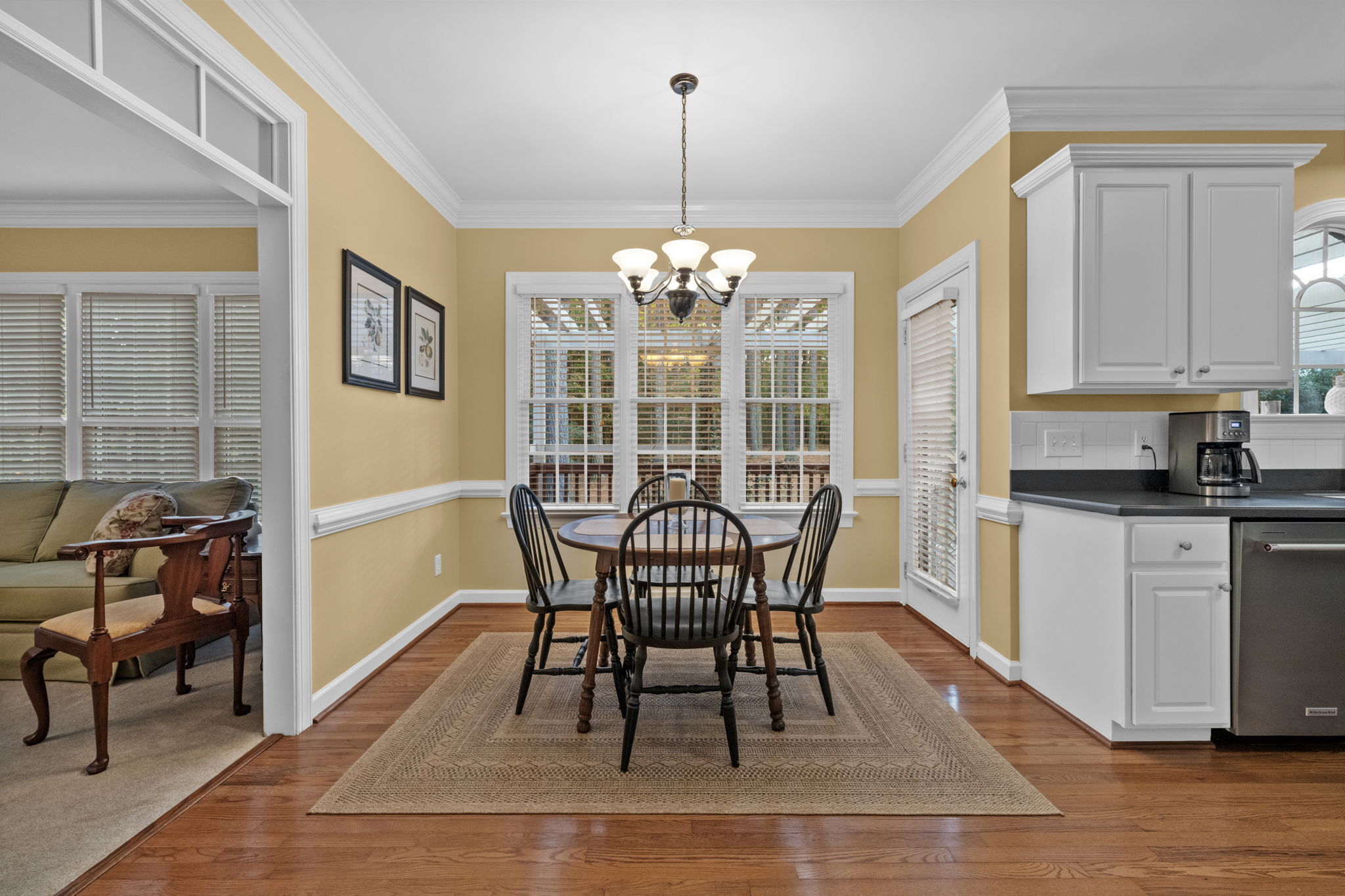 Experience the perfect balance of comfort and sophistication in this beautifully designed home, where modern convenience meets timeless style. Every detail has been thoughtfully crafted to support both relaxed everyday living and effortless entertaining. At the heart of the home, the kitchen features stainless steel appliances, a center island, and plenty of space to inspire your culinary creativity. Enjoy peaceful mornings in the bright breakfast area with easy access to your private deck and patio—ideal for al fresco dining or quiet moments outdoors. The formal dining room, adorned with wainscoting and crown molding, sets the stage for memorable gatherings, while the adjacent living room or home office offers a versatile space highlighted by elegant transom doorways. The primary suite provides a serene retreat, complete with a walk-in closet and a comfortable area for unwinding. Gleaming hardwood floors flow throughout much of the main level, bringing warmth and character to every space. A spacious, unfinished attic offers endless potential for customization. Perfectly situated near I-540, the new Publix shopping center, and Buffaloe Road Athletic Park & Aquatic Center, this home captures the essence of refined, modern living.